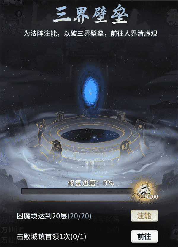 当你修为达到返虚/破虚中期后,,,,可在城镇寻得芸丫并激活神秘法阵,,通过收集材料、、击败首领等方式为法阵注能,,,,借以打破三界壁垒,,,开启支线剧情“清虚旧梦”